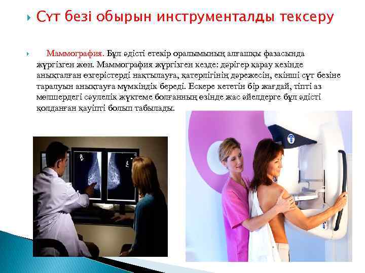 Маммография. Бұл әдісті етекір оралымының алғашқы фазасында жүргізген жөн. Маммография жүргізген кезде: дәрігер қарау кезінде анықталған өзгерістерді нақтылауға, қатерлігінің дәрежесін, екінші сүт безіне таралуын анықтауға мүмкіндік береді. Ескере кететін бір жағдай, тіпті аз мөлшердегі сәулелік жүктеме болғанның өзінде жас әйелдерге бұл әдісті қолданған қауіпті болып табылады.